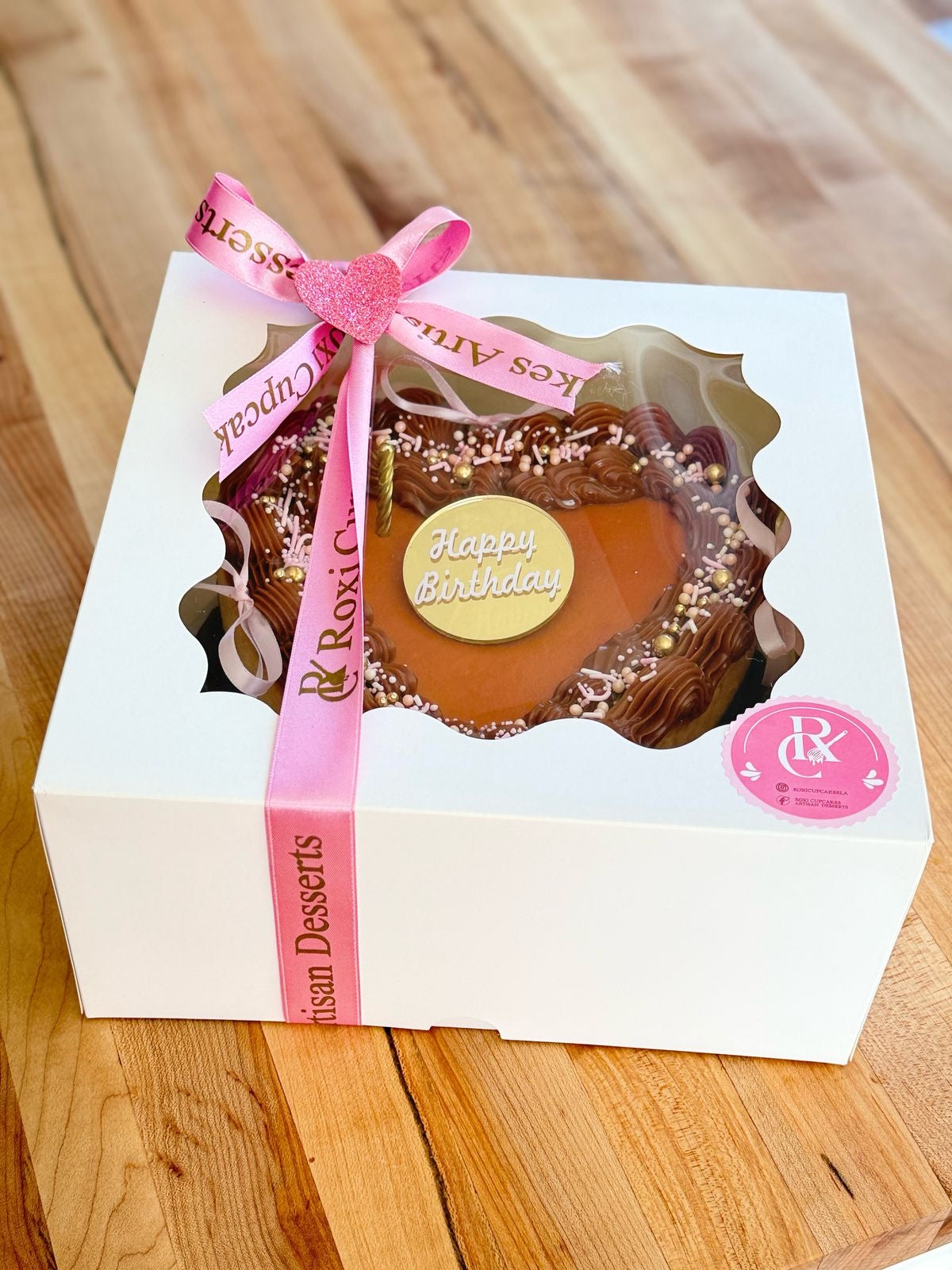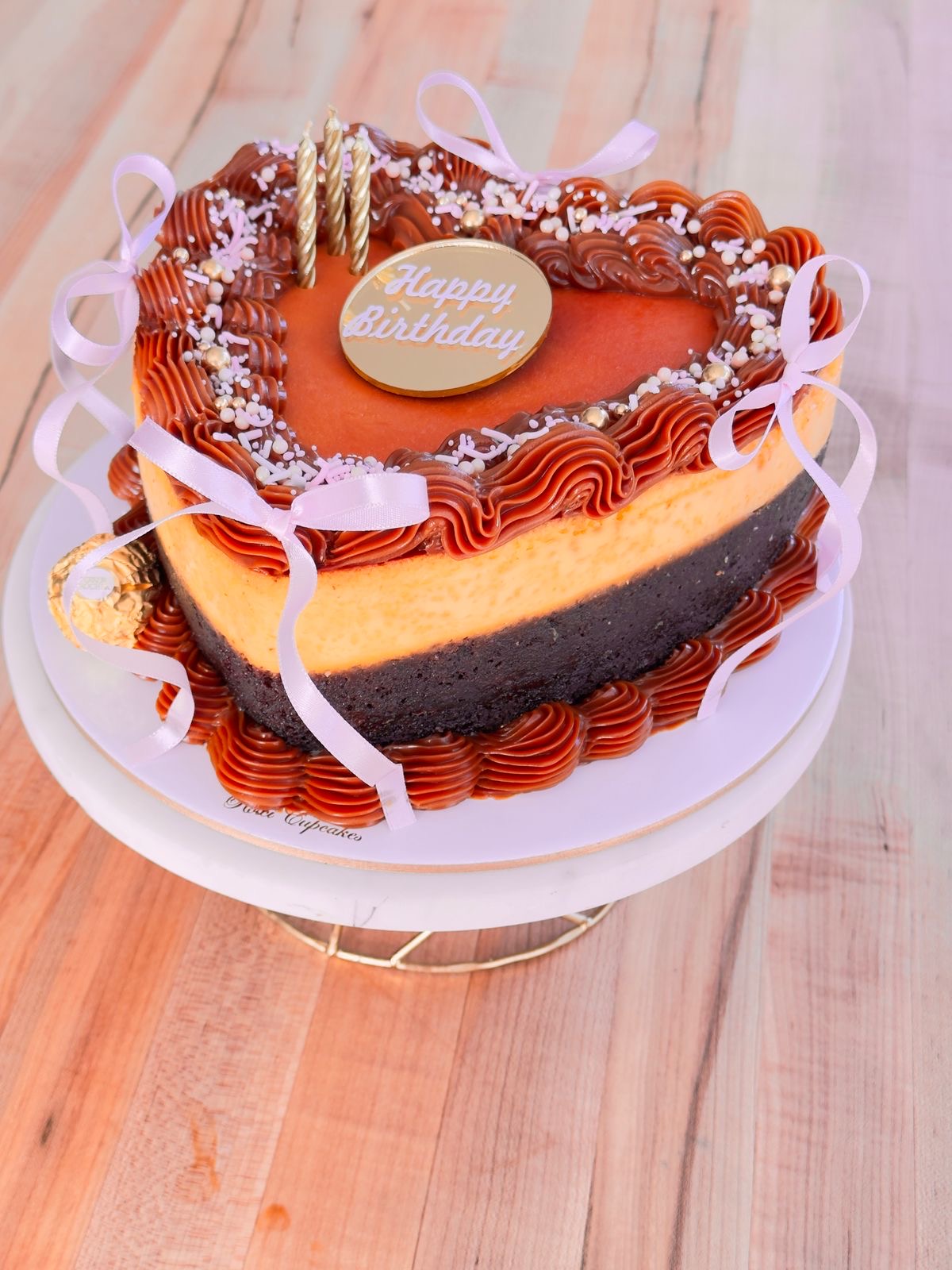 “Un chocoflan hecho con amor, ideal para celebrar momentos especiales. Con forma de corazón, bizcocho de chocolate, flan cremosito y una cobertura generosa de dulce de leche decorada con perlitas, lazos y detalles en rosa dorado. Perfecto para decir ‘te quiero’ con sabor y estilo. ¡Hecho a mano por RoxiCupcakes!