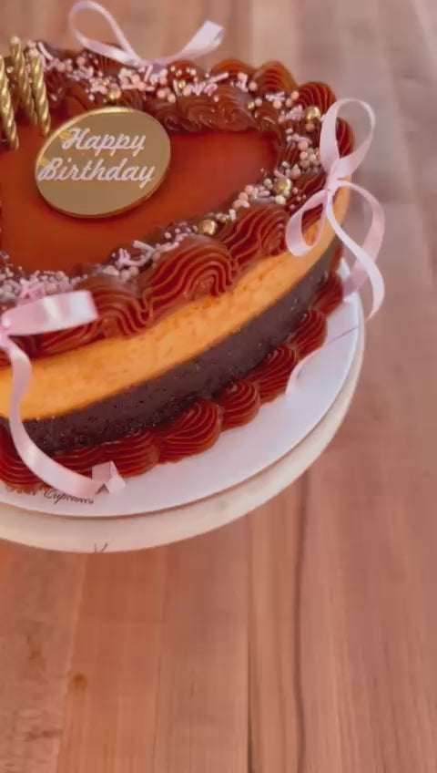"A chocoflan made with love, ideal to celebrate special moments. Heart-shaped, chocolate cake, creamy flan and a generous topping of dulce de leche decorated with pearls, bows and details in golden pink. Perfect to say 'I love you' with flavor and style. Handmade by RoxiCupcakes!
