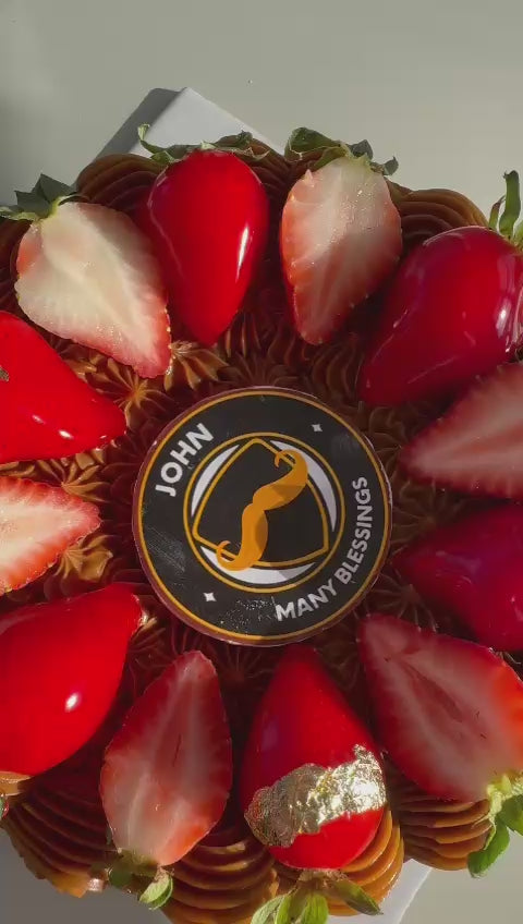 Celebrate in a big way with our birthday chocoflan: a delicious base of chocolate sponge cake, soft and creamy flan, and a generous layer of dulce de leche decorated with strawberries and gold sheets. Pure love in every layer, made 100% handmade by RoxiCupcakes!