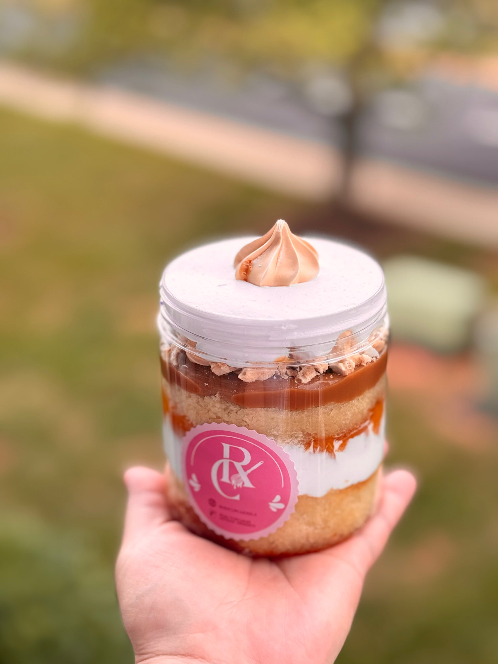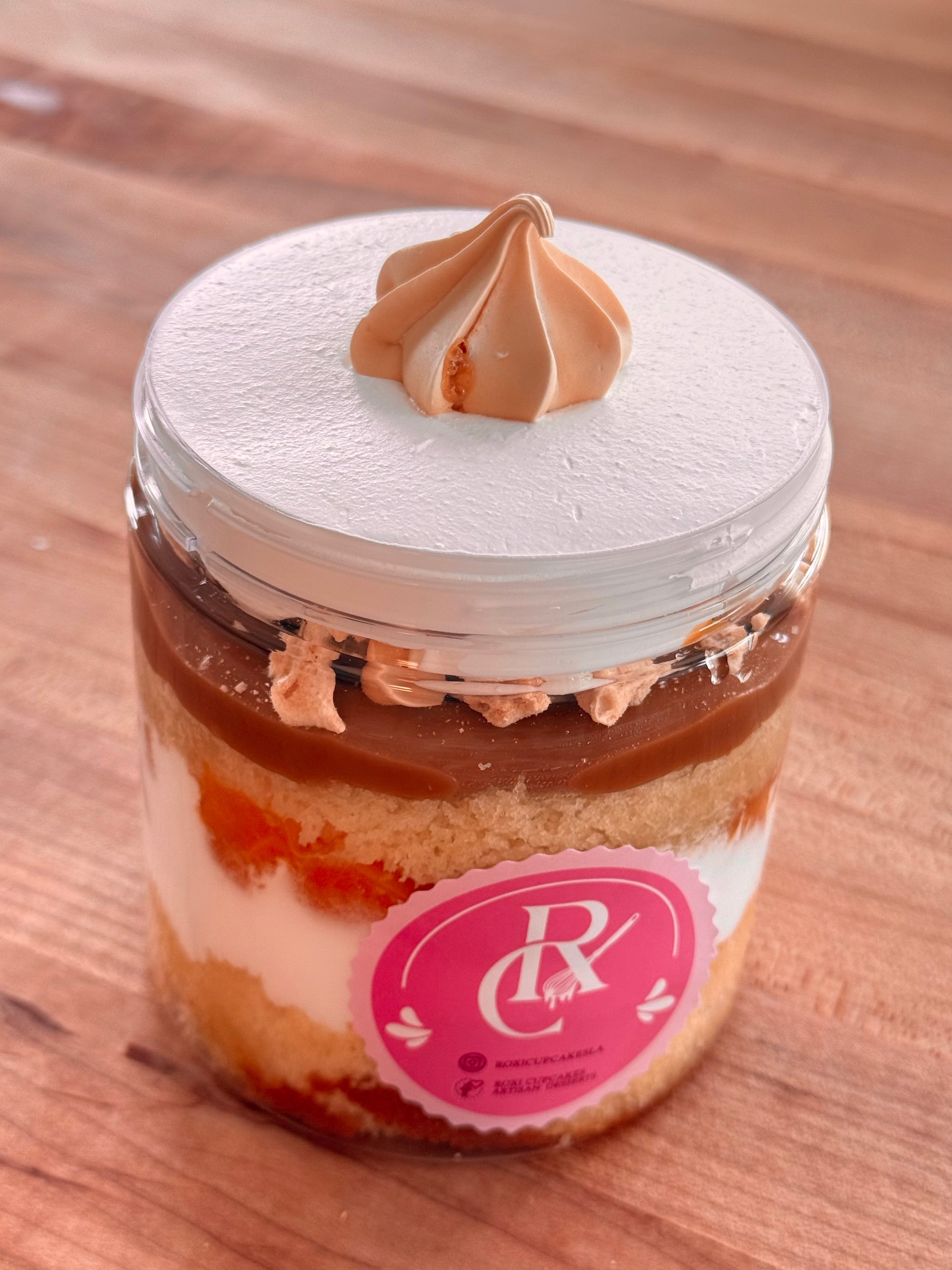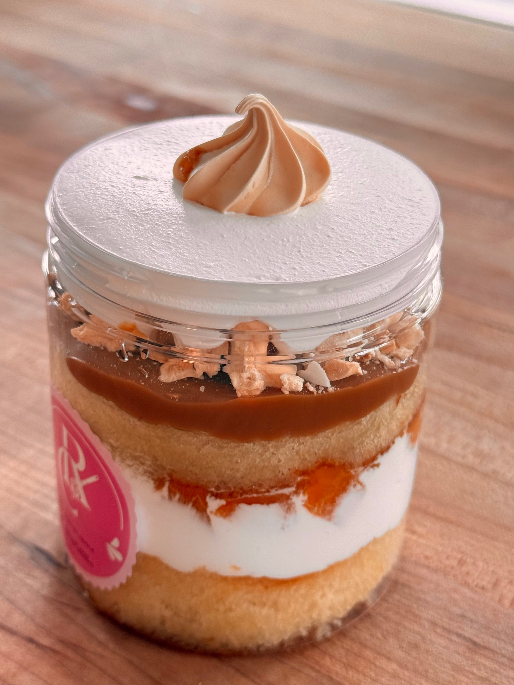 Layers of fluffy sponge cake, milk caramel, juicy peaches, whipped cream, and crunchy meringue.