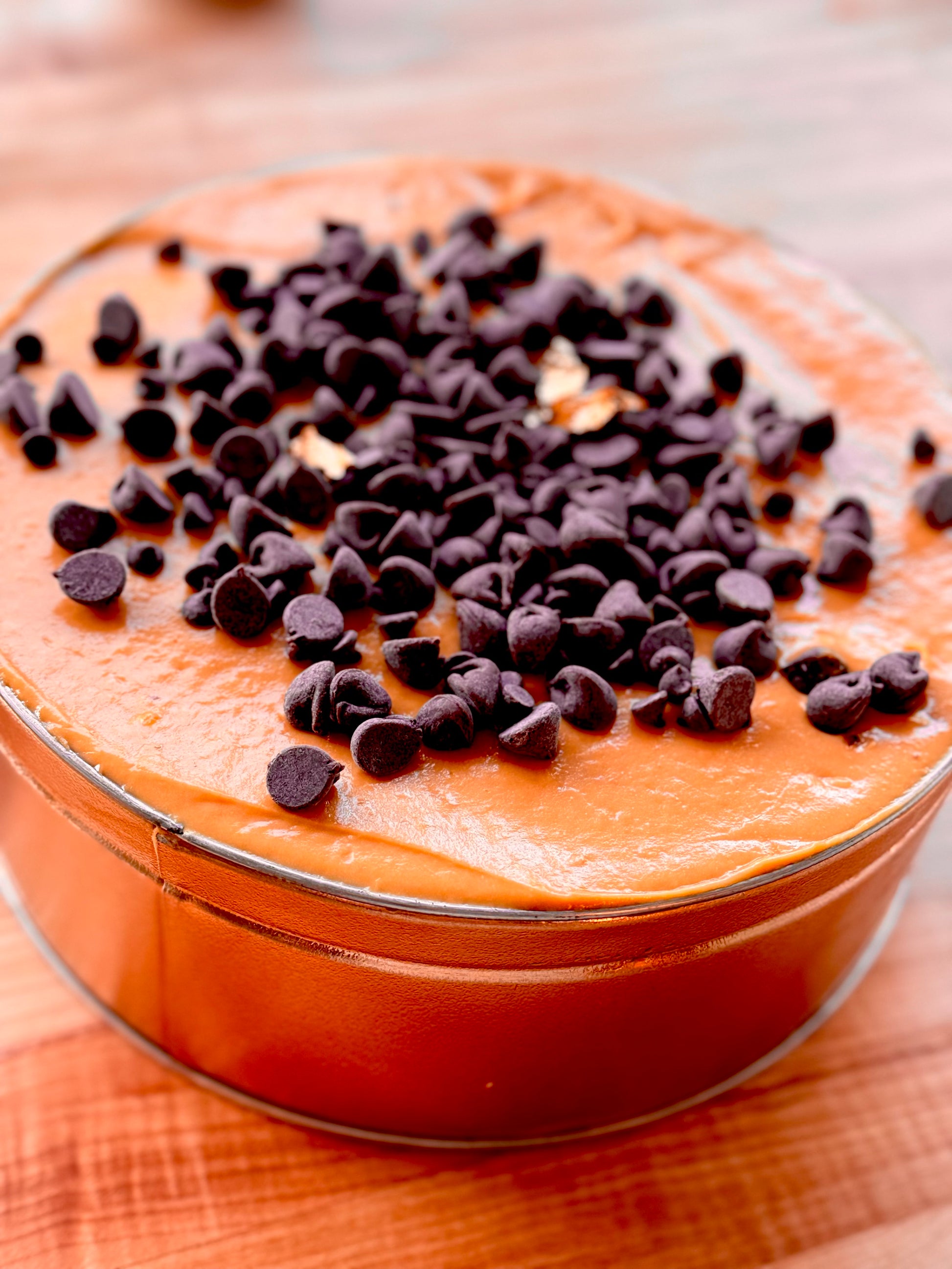 Enjoy our exquisite choco-lúcuma cake, carefully crafted with two layers of fluffy chocolate sponge cake, interspersed with a generous layer of chocolate fudge and a layer of lúcuma caramel. The finishing touch: a topping of Hershey's chocolate chips.